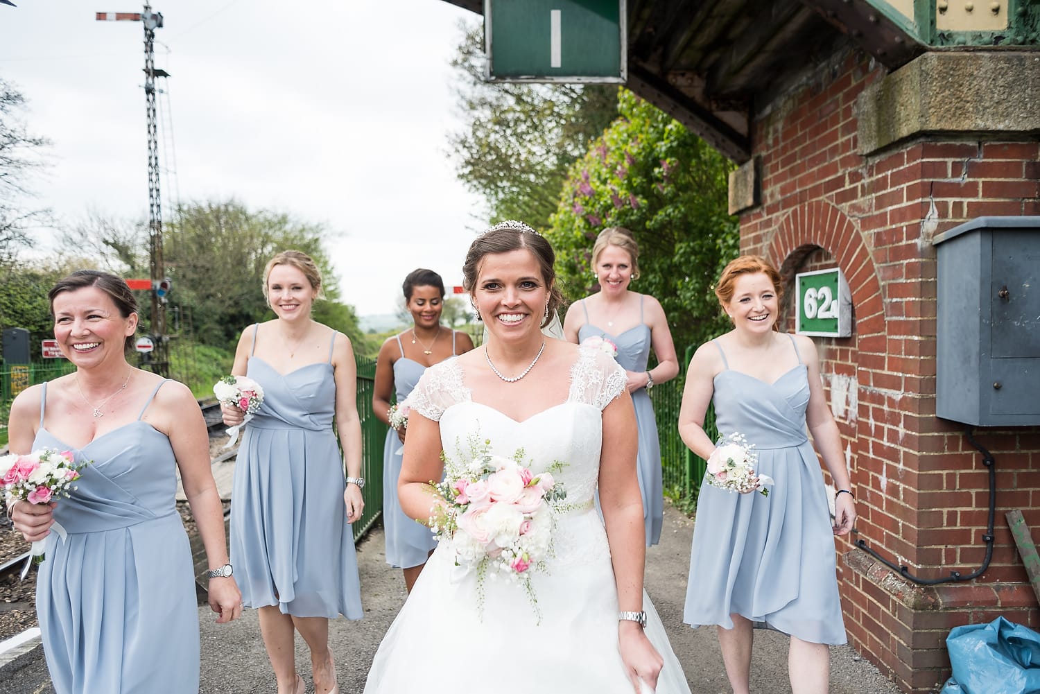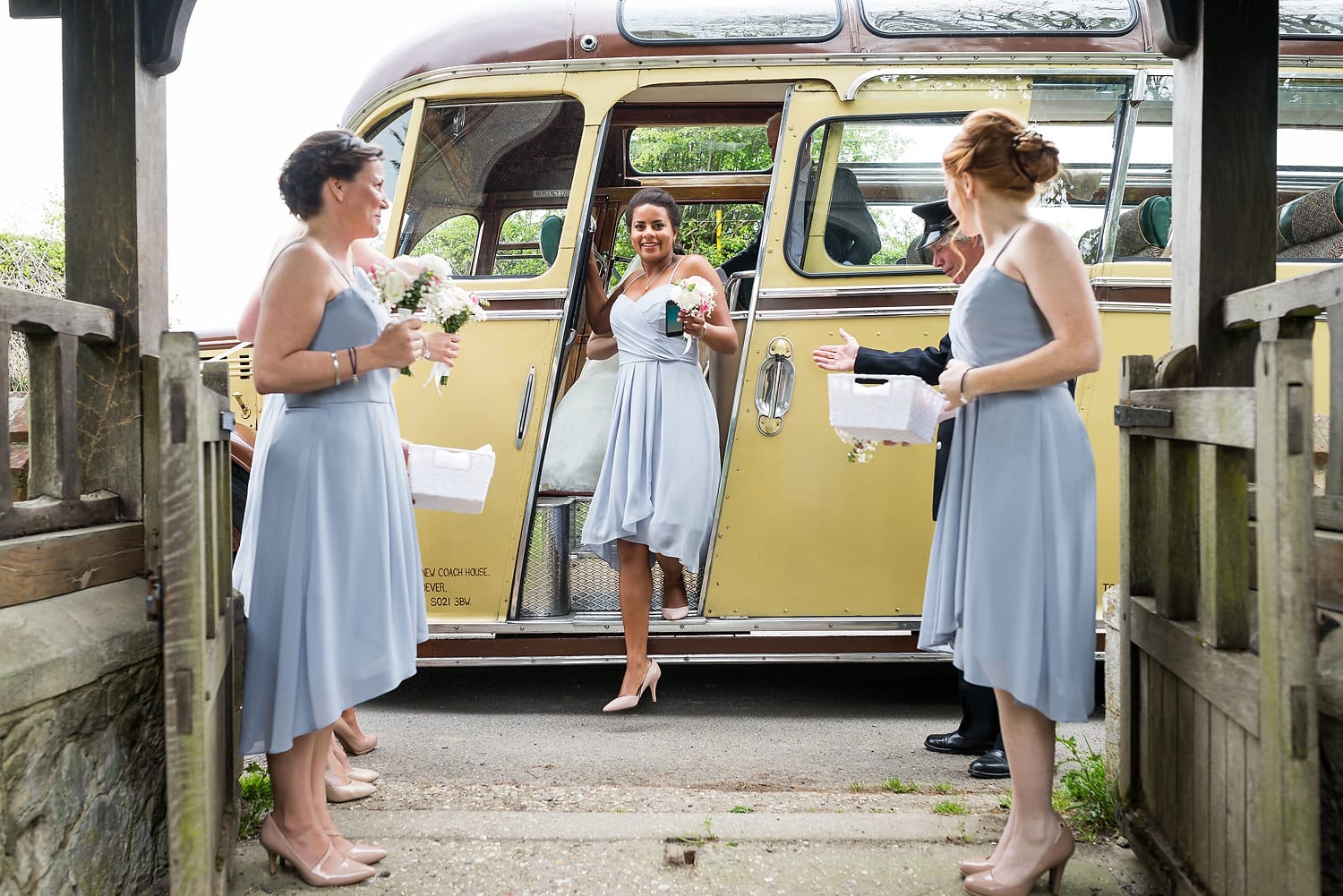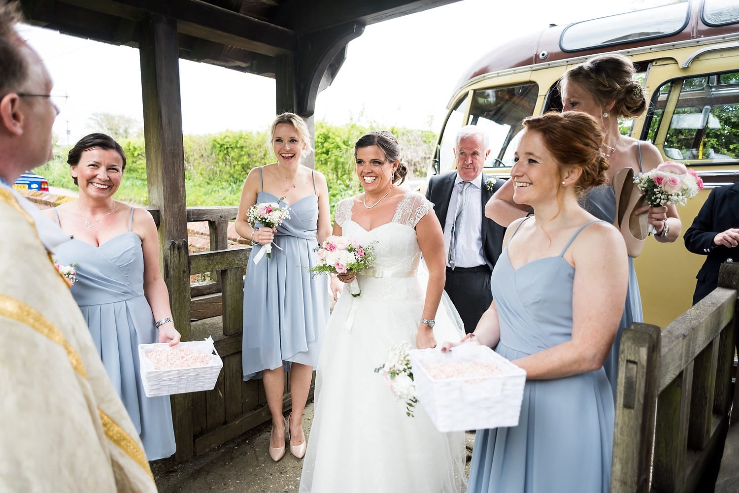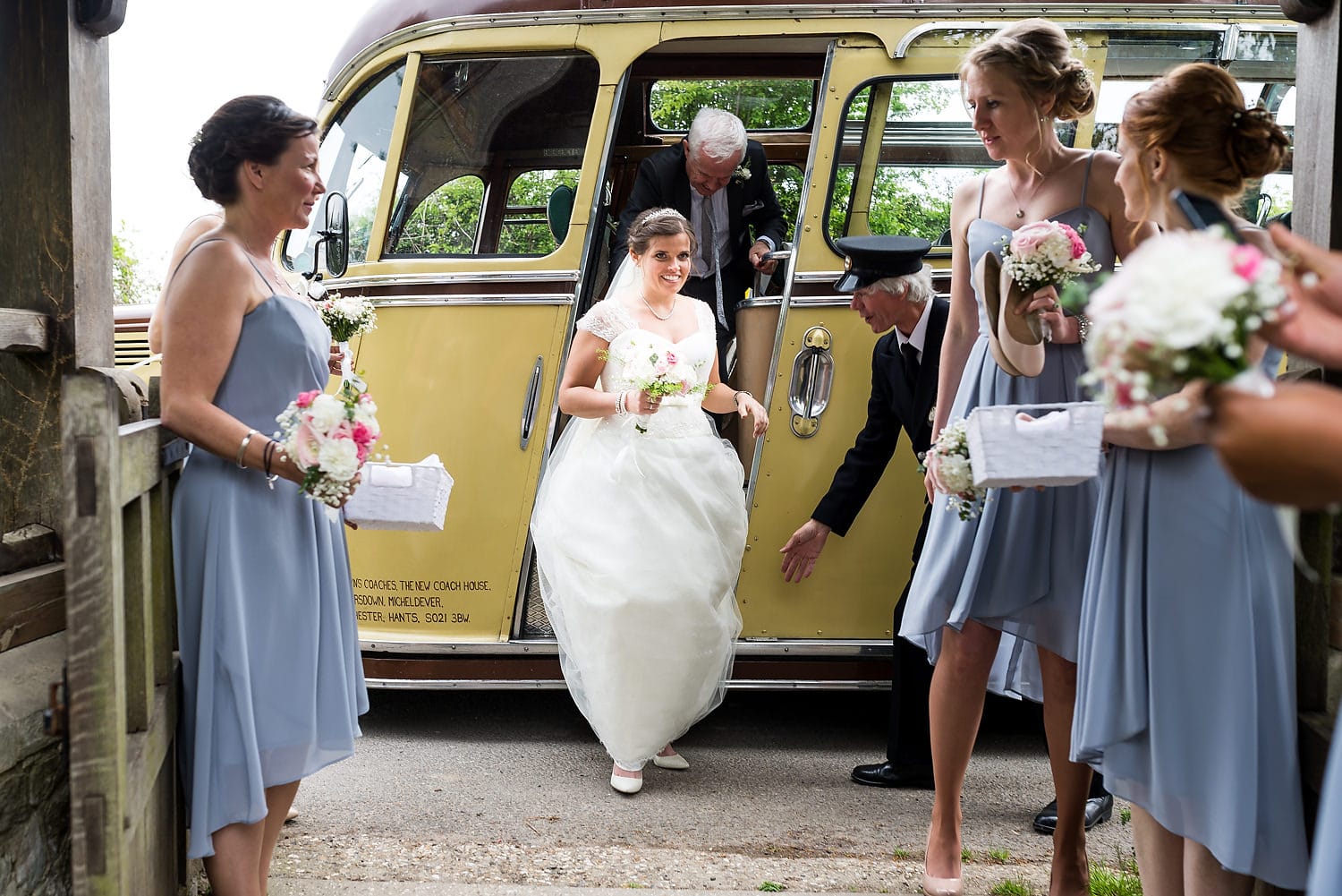 This was my first time photographing a Bonhams Barn wedding. This Hampshire wedding venue is situated in the village of Holybourne, which is just outside Alton. The day began with the wedding party getting ready at Watercress Lodges in Ropley. I loved this location next door to Ropley train station, and a place where you can even jump on the historical Watercress Line. When everyone was ready, they jumped onto the fun bus provided by Mervyns Coaches for the wedding ceremony at the Church of Holy Rood in Holybourne. Villages do not get more picturesque than this! After the ceremony, the bridal party jumped back onto the bus, and we headed to the barn for the wedding reception. The guests were wowed by the rolling hills and beautiful Hampshire landscape that surrounds this oak-framed barn.