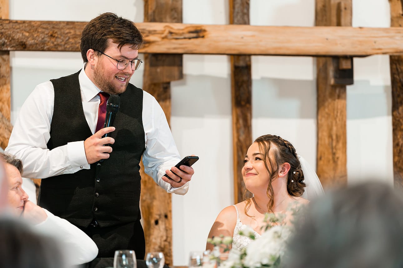 The ceremony took place in Clock Barn’s main barn — a space full of warmth and rustic charm. With its soaring beams and soft fairy lights, it felt both grand and intimate. Alice walked in with her dad to enjoy live acoustic music, accompanied by a reading from Pete’s sister before the couple exchanged vows.